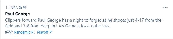乔治表现很差,17中4,一度10中1,若不是末节拿下了13分,他可能会被喷地体无完肤20分11板2助数据不是特别差,但是当球队需要他的时候,小卡遇到犯规麻烦的时候他没有站出来!在场上一次次浪费空位三分的机会,若不是他表现这么差,在爵士起势的时候,快船也不至于被反差并拉开分差,他糟糕的表现也瞬间被热议到热搜榜第一!