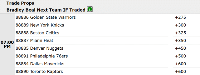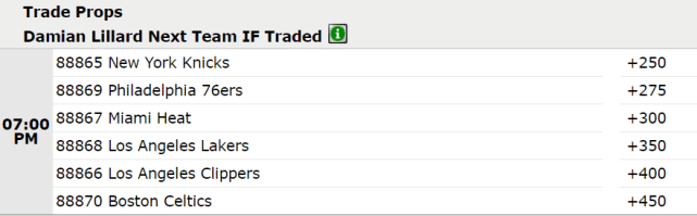 如果利拉德被交易,最被看好的下家是纽约尼克斯(+250)。紧随其后的球队是费城(+275),接下来依次是热火(+300)、湖人(+350)、快船(+400)和凯尔特人(+450)。此前,多位记者报道称,目前对利拉德感兴趣的球队很多,其中一些球队甚至已经拨通开拓者的电话,正式询价利拉德。
