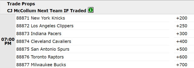尼克斯一直想追逐明星球员,来进一步升级阵容。他们拥有7500万左右的薪金空间,而且也有选秀权和年轻人可供交易。从赔率排名来看,他们不但领跑利拉德争夺战,而且在CJ-麦科勒姆的赔率榜上也排名第一。