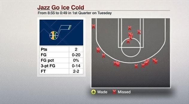 连续20次出手不中,实在罕见。ESPN晒出了爵士连续20投不中的投篮图,其中14次出手在三分线外。ESPN还表示,20次出手中,有15次出手是在快船防守下投出的。快船的防守表现还是很出色的。