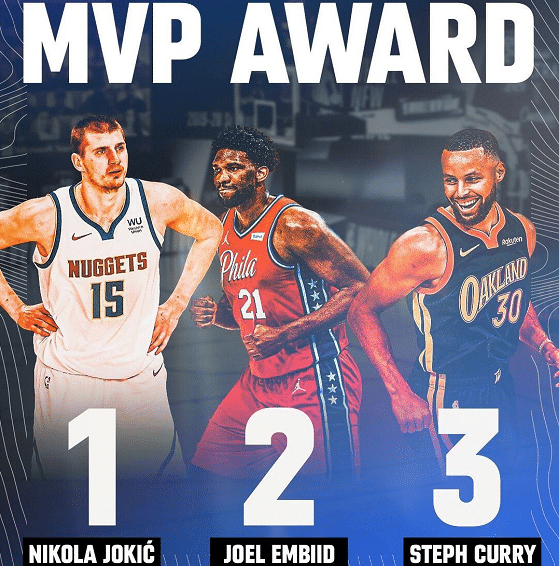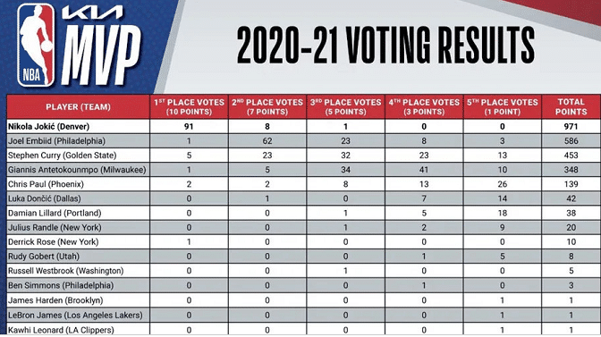 来源:JRS直播网06-09 15:40JRS直播网讯 北京时间6月9日,NBA公布了本赛季常规赛MVP得主,掘金中锋约基奇当选,他也是历史上第一个二轮秀的MVP,他是以第41顺位进入到联盟的。同时约基奇也是掘金历史上的第一MVP,奥尼尔之后第一位中锋MVP等等一系列的荣誉都属于约基奇。在选票层面,约基奇拿到100张第一选票中的91张,总分971分。恩比德、库里、字母哥、保罗和东契奇分居第2-6名,詹姆斯连续18年获得MVP选票。
