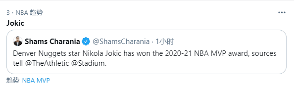 约基奇夺得MVP瞬间登上推特热搜榜第三名,ESPN晒出约基奇和字母哥、纳什、诺维斯基、邓肯以及奥拉朱旺P照,发推写道:世界MVP,他加入了一个特殊的组织。