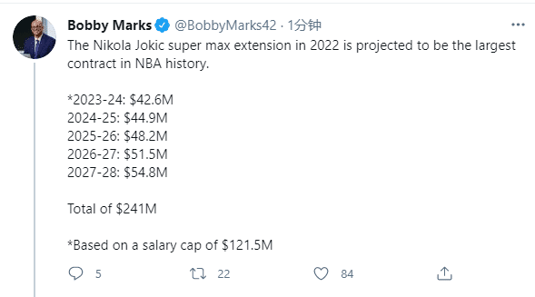 据ESPN名记Bobby Marks报道,约基奇可以在2022年签下一份5年2.41亿美元历史最大合同,最后两年的年薪高达5000多万美元;目前约基奇1.47亿美元大合同还剩下两年,明年他有望成为史上最贵中锋。
