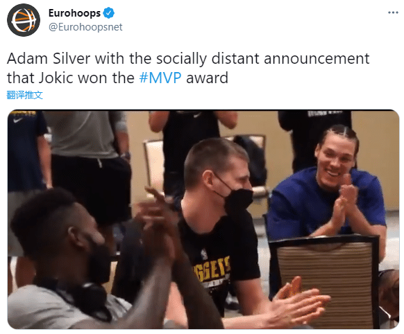 通过视频连线的方式,联盟总裁亲自宣布约基奇获得MVP,随后掘金全队都为约基奇而鼓掌庆祝,约基奇拥抱主教练马龙并且发表获奖感言:这是一个个人荣誉,但没有你们,我是做不到的,谢谢你们所有人!
