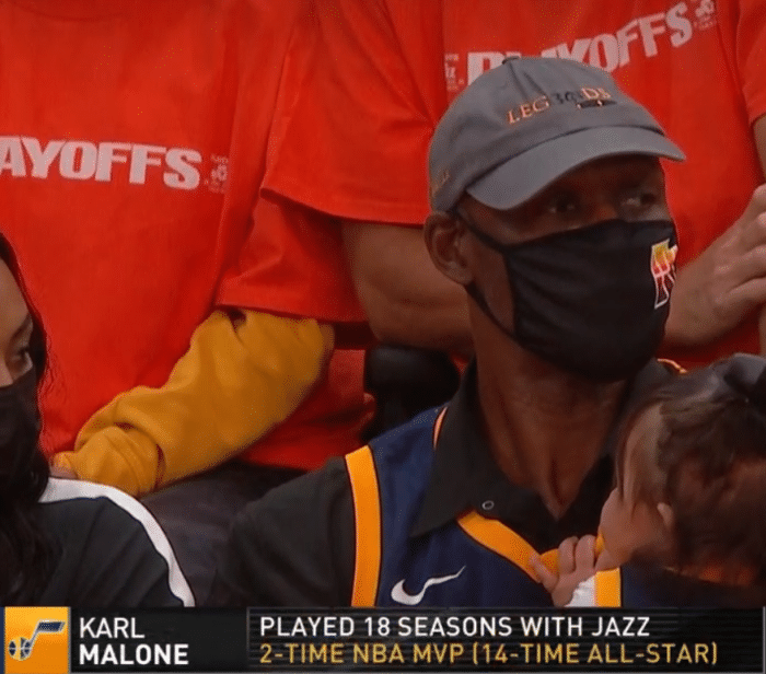 比赛期间,镜头给到爵士名宿卡尔-马龙,为爵士效力18个赛季,14次入选全明星以及2次夺得MVP,常规赛36928分高居历史得分榜第二位;很明显爵士名宿老了,也更加精瘦了。