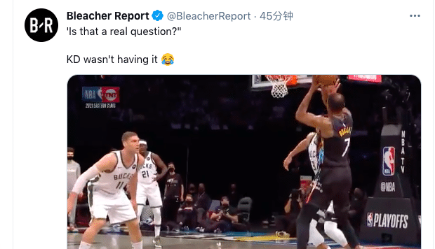 雄鹿这边好不容易得到两分,杜兰特一个干拔解决问题,上半场,杜兰特仅仅用了10次出手,命中了7个球,其中三分球4中3,拿到了21分3篮板2助攻的表现带领球队大比分领先。