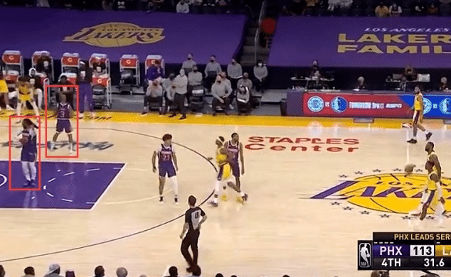 通过这个抽象人物的动作以及明显的“辫子”很容易辨认出是克劳德,他和保罗在比赛即将结束前都有羞辱性的举动,这很可能是老詹比赛结束立刻返回更衣室不拥抱对手的原因之一!当时太阳全队都很兴奋,尤其淘汰的对手是卫冕冠军湖人,但他们的种种羞辱性行为还是引发了一些争议!