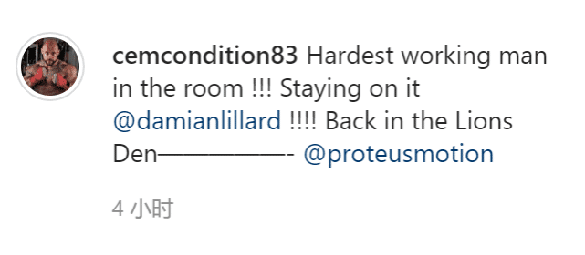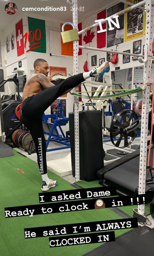 利拉德也在这一天回到训练场,训练师晒出了利拉德的照片,并配文写道:“杀手心态!周一上午,利拉德已经回到训练馆,我问他是否准备好打卡上班了,他说他总是做好准备的状态。”训练师还晒出了一段利拉德的训练集锦,把他称为“最努力的人”。