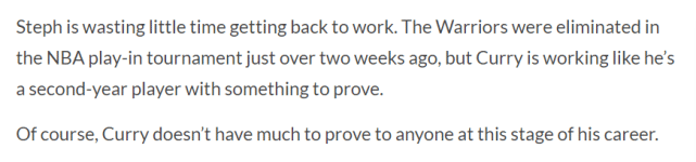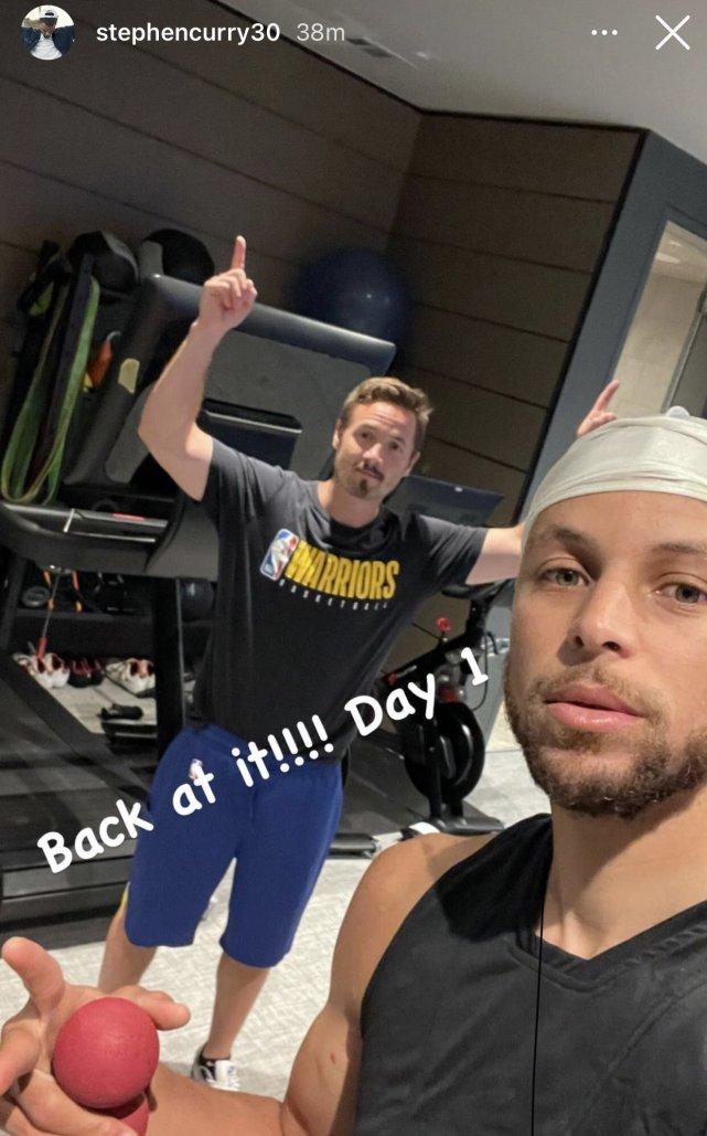 库里在社媒上晒出了自己和训练师的合影,并配文写道:“回来的第1天!”此前,勇士在附加赛出局后,库里曾和妻子阿耶莎前往墨西哥度了个假,但很快就回到了训练馆。美媒clutchpoints称赞库里就像一个需要证明自己的二年级球员那样努力,当然,事实上他在生涯这个阶段已经无需证明什么。