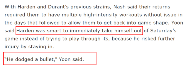 Yoon认为哈登在43秒感到不适后第一时间退场,是非常聪明的选择。如果他当时试图留在场上打完比赛,会有进一步受伤的风险。“他躲过了一颗子弹,”Yoon评价道。