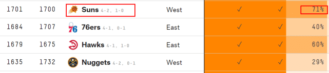 赛后,数据网站FiveThirtyEight第一时间更新晋级概率,太阳的晋级概率从赛前的59%升至目前的71%,这意味着美媒看好太阳的晋级概率超过七成了。