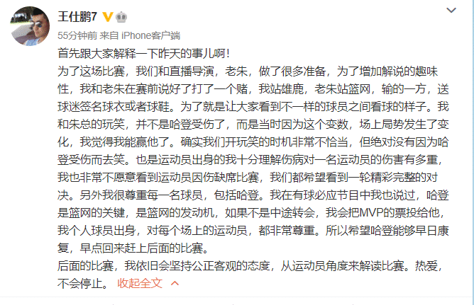 来源:JRS直播网06-07 15:20JRS直播网讯 北京时间6月7日,前男篮国手现在作为篮球评论员的王仕鹏,在社交媒体上发布动态。他对此前一天哈登受伤时他哈哈大笑一事,做了长篇幅的澄清。王仕鹏表示,之所以当时哈哈大笑,并不是因为哈登受伤了,而只是和朱芳雨的一个玩笑话。王仕鹏也承认玩笑时间点不恰当。最后,王仕鹏表示希望哈登早日康复重返赛场。