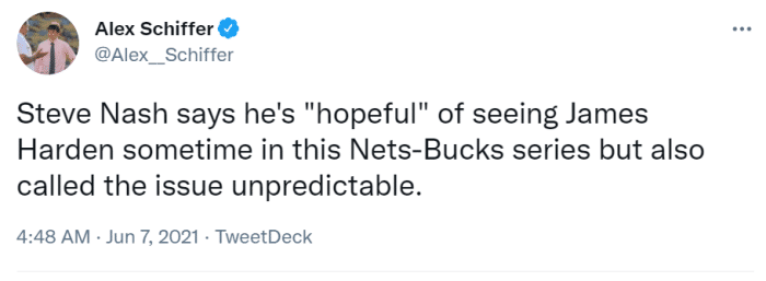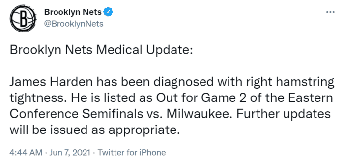 篮网更新伤情!哈登右腿筋紧张将缺阵G2,回应詹皇关心:谢谢兄弟