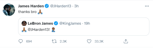 哈登的意外受伤,引起热议,湖人球星詹姆斯也第一时间在社媒上为他祈祷。哈登伤后的首次发声,也是转发了詹姆斯的祈祷,并回应道:“谢谢,兄弟。”