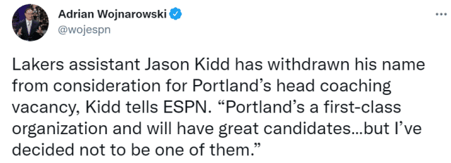来源:JRS直播网06-07 15:17JRS直播网讯 北京时间6月7日,据ESPN报道,洛杉矶湖人队助教杰森-基德宣布自己已退出开拓者新主帅位置的竞争。“波特兰是一支一流的球队,他们将拥有出色的主教练候选人,但我决定不成为其中之一,”基德说道,“无论他们选择谁来填补特里(斯托茨)留下的空缺。”