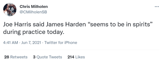 纳什表示,哈登绝对有望在这轮系列赛中复出,而且哈登本人也希望能尽快复出,但球队要从保护他的角度出发。队友乔-哈里斯透露,哈登在训练日的精神状态很不错。篮网今天全队安排了训练,官方更新的训练照片都是角色球员,看来杜兰特和欧文等主力应该训练量很轻。