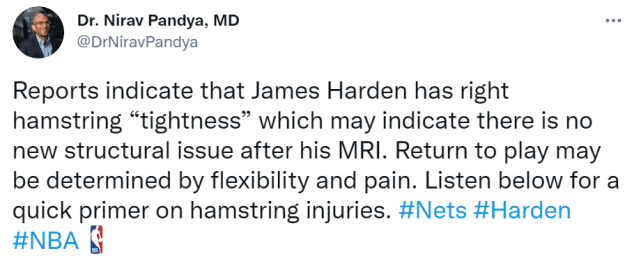 只是腿筋紧张,意味着没有出现严重的拉伤。医学专家Nirav Pandya也第一时间解析了哈登的伤情。他表示,腿筋紧张意味着没有新的结构性损伤。何时回归,取决于他的灵活度以及疼痛感。换句话说,哈登要在运动自如和没有疼痛的困扰下,才能安心复出。