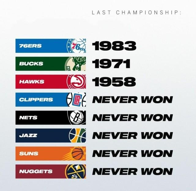 来源:JRS直播网06-07 15:10JRS直播网讯 北京时间6月7日,随着快船击败独行侠,本赛季的八强已经全部产生。他们是东部的费城、篮网、雄鹿、老鹰,西部的爵士、太阳、快船和掘金。美媒很快回顾了八支球队上一次夺冠的时间,其中竟有五支球队在队史上从未夺冠。而其他三支球队,最近的一次夺冠也要追溯到1983年,也就是38年前。