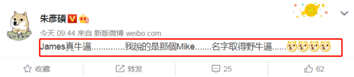 而篮球解说员朱彦硕则称赞了篮网新援迈克詹姆斯,他的这番话也非常有趣,“詹姆斯真牛,我说的是那个迈克,名字也牛”。