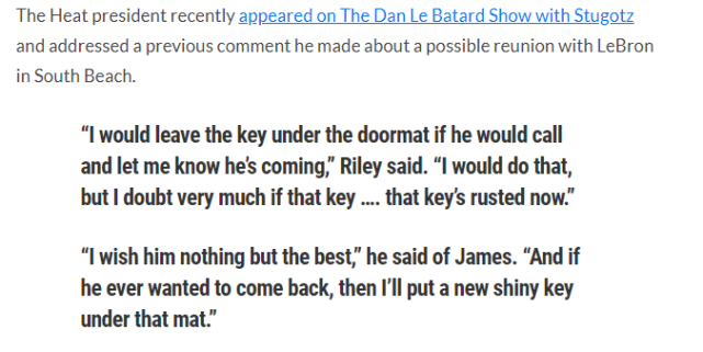 “如果他(詹姆斯)给我打电话,告诉他要来,我会把钥匙放在门垫下,”莱利说道,“我会那么做的,但我怀疑现在那把钥匙是不是已经生锈了。”