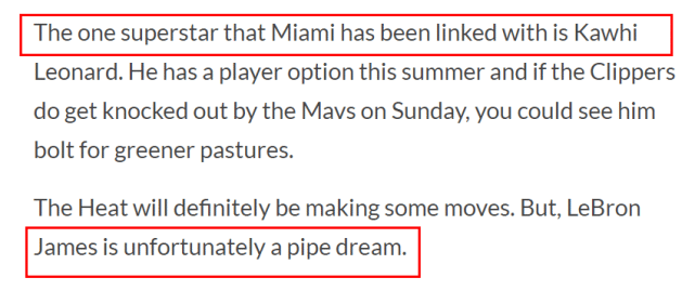 clutchpoints指出,在近来的流言中,和热火常常联系在一起的球星是科怀-莱昂纳德。如果快船被独行侠淘汰出局,预计他有可能考虑选择其他去处。clutchpoints建议热火还是专心追求小卡,詹姆斯回归纯属白日做梦。