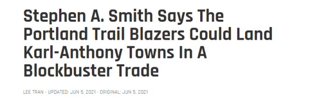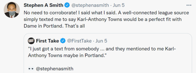 “我刚收到某个人的短信……他跟我说卡尔-安东尼-唐斯可能会去波特兰。你可以把努尔基奇、CJ-麦科勒姆或者其他人放进交易,然后得到唐斯。”史密斯在节目上说道。随后,史密斯在社媒上转发了自己的节目并配文写道:“无需证实什么,我说了我该说的,一个人脉广泛的消息人士给我发了短信,对我说唐斯会和利拉德在波特兰完美契合,就是这样。