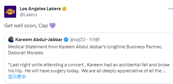 76岁贾巴尔意外摔倒导致髋部骨折,已经住院并将在今天接受手术,美媒CLuth Points发推希望贾巴尔早日康复;湖人官方转发贾巴尔方面的声明,并发推写道:早日康复,卡里姆。