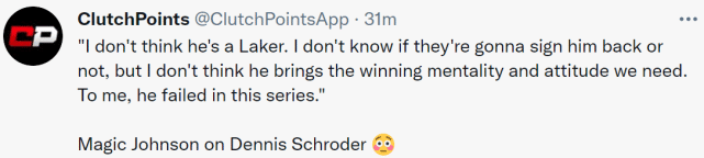总经理佩林卡在随后的采访中提到施罗德,把他称为一个“斗士”。但湖人名宿“魔术师”约翰逊可不这么想,他不喜欢施罗德,也看衰他在湖人的前景。在接受媒体采访时,约翰逊说:“我没把他当成湖人球员,我不知道他们会不会把他签回来,但我觉得他没带来我们需要的胜利心态和态度,在我看来,他在这轮系列赛里是失败的。”
