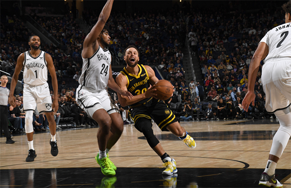 末节,勇士被篮网打出10-2反超攻势,维金斯中投扳平比分,布里奇斯连得4分,波杰姆斯基命中三分,托马斯三分打铁后库里精彩突破上篮,库里单挑托马斯急停中投,之后库里连中三分打停篮网,库里98秒连得10分点燃球馆,库里做出“暂停手势”庆祝;暂停回来,篮网失误库里继续中投得分,托马斯和布里奇斯得分回应,篮网包夹库里,汤普森轰进三分,克拉克斯顿强硬2+1。