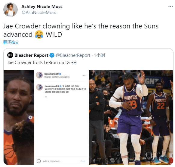 来源:JRS直播网06-05 11:33JRS直播网讯 北京时间6月5日,湖人和太阳的首轮系列赛已经结束了,但两队之间的恩怨还未了;太阳悍将克劳德继续嘲讽詹姆斯,晒照挑衅詹姆斯,还回击詹姆斯此前的言论;克劳德如此举动引热议,此举真是拉仇恨。