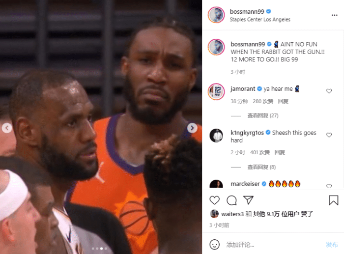 克劳德晒出G6被驱逐离场之后,他模仿詹姆斯跳舞的画面,还晒出他死亡凝视詹姆斯的画面,在INS上写道:兔子拿枪的时候可不好玩,还剩12场胜利;对此,灰熊球星莫兰特凑热闹,留言:听到你说的了。