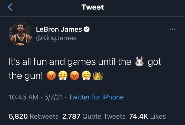 詹姆斯曾在5月8日发推写道:一切都是玩闹和游戏,直到兔子拿到枪。