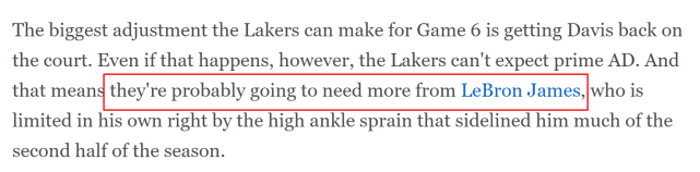 比起30分惨败的G5 ,湖人在G6能做出的最大调整就是让浓眉回到球场。即便他真的回归,湖人也无法指望他的状态有多好,毕竟,腹股沟伤病不是短期内就能彻底痊愈的。这意味着湖人需要詹姆斯做出更多的贡献。The Athletic记者Seth Partnow指出,詹姆斯在这轮系列赛里的自主进攻状态可能是自2011年总决赛以来最糟糕的,G5一战,詹姆斯在上半场只得到7分,10投3中,湖人上半场就落后30分,比赛胜负已经失去悬念。