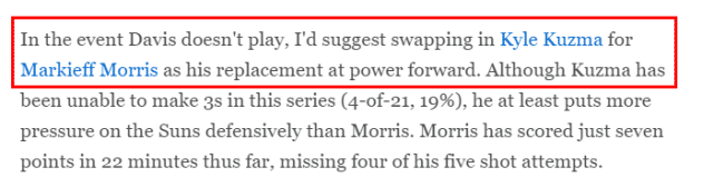 除此之外,佩尔顿还建议湖人进行两个调整。其一,让库兹马取代大莫里斯,进入首发阵容。虽然库兹马在这轮系列赛的三分很铁(21中4,命中率19%),但比起大莫里斯,他还是能给太阳的防守带来更多威胁。大莫里斯这轮系列赛只打了22分钟,一共得到7分,5投1中。