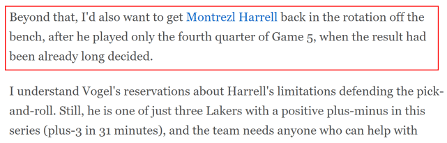 其二,让哈雷尔回到轮换阵容。在G5的比赛中,哈雷尔只打了已经成为垃圾时间的第4节,单节5中3,得到9分3篮板。佩尔顿表示自己能理解沃格尔担心哈雷尔在防守挡拆时的局限性,但哈雷尔仍是湖人这轮系列赛仅有的三位正负值为正的球员之一(31分钟+3)。湖人需要增强得分能力,而常规赛场均不到23分钟能得到13.5分的哈雷尔,仍是最佳选择之一。