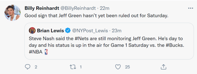 纳什在训练结束后接受采访,他谈到了还在养伤的杰夫-格林。纳什表示,篮网仍在密切监控格林的伤势,目前是每日观察的状态,暂时没有排除他出战G1的可能性。