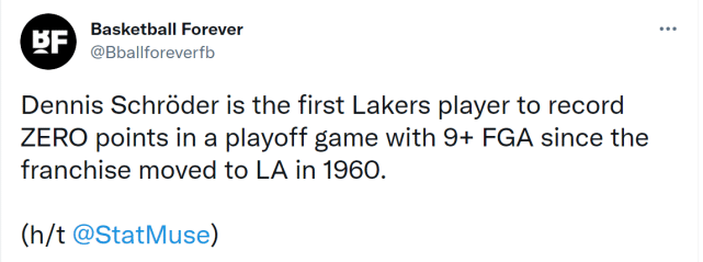 其中,施罗德表现最差的一场比赛是天王山之战,他9投0中,一分未得,个人正负值是-30。赛后,数据显示,自从湖人1960年搬到洛杉矶以来,施罗德是第一位在季后赛至少出手9次,却没有得分的湖人球员。