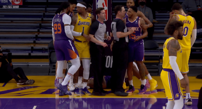 波普恶犯引热议,湖人和太阳总共3人吃到技术犯规;湖人半场41-62落后太阳21分,大比分2-3落后,G6又打得十分糟糕;浓眉带伤出战却提前离场,因腹股沟伤势只能坐在替补席,甚至用毛巾捂脸不敢看比赛;中场休息时,湖人官方宣布浓眉本场比赛不会回归,被迫伤退。