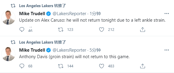 浓眉伤停还有坏消息,湖人悍将卡鲁索遭遇左脚踝扭伤,本场比赛也不会回归;湖人真是雪上加霜,陷入伤病危机的湖人太难了。