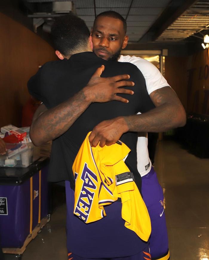 詹姆斯回到更衣室后,双膝都包裹着厚厚地冰袋,如此一幕令人心酸;洗澡之后换了一套湖人训练服,然后在球员通道里,詹姆斯把自己的亲笔签名23号战袍送给布克,两人拥抱并且合影留念。