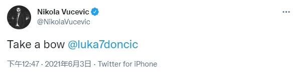 赛后,武切维奇发推在东契奇建议道:“卢卡,来个鞠躬庆祝啊!”意思是东契奇缺少点霸气吗?当然了更多还是为调侃特雷杨!今天他轰下36分9助攻淘汰了尼克斯,率队打进了东部半决赛,从这点上来说他已经领先东契奇做到了。