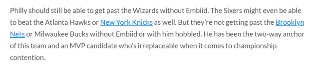 美媒clutchpoints认为,缺少恩比德,费城依然能淘汰奇才晋级,甚至击败尼克斯和老鹰的胜者,进入东部决赛,但是没有恩比德,他们过不了雄鹿或者篮网这一关。这位MVP候选人在内线的作用太大了,要想成为总冠军竞争者,他的位置是不可取代的。