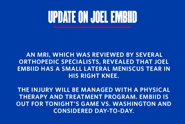 恩比德在双方的第4场比赛首节受伤,随后退出比赛。当时他的一次上篮,遭遇小洛佩斯的封盖,摔倒在地。球队当时给出的退场理由是右膝酸痛,而核磁共振检查的结果显然更加严重。半月板轻微撕裂,对于一个体型庞大的中锋来说,不是什么小伤,如果不谨慎对待,可能会酿成更严重的后果。考虑到恩比德的伤病史,费城必须更加谨慎。