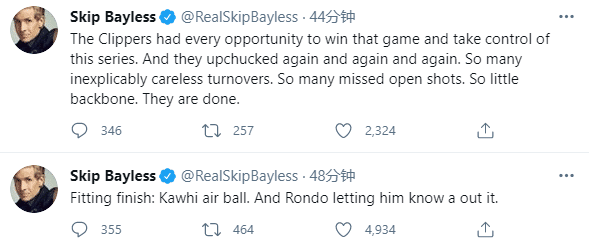 发推写道:快船本有无数机会可以赢下比赛,掌控系列赛。但他们一次又一次地犯错,多少次莫名其妙的失误?投丢多少次的大空位?没决心没毅力,快船要沉了。
