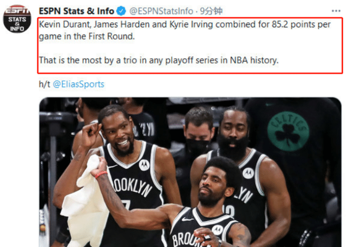 据美媒统计,三巨头在首轮的进攻火力历史第一,杜兰特和哈登,欧文三人合计能砍下85分,而杜兰特一人贡献32.6分,投篮命中率56.5%,三分球命中率50%,罚球命中率91.5%。死神杜又来了,加上哈登和欧文这两大得分手,还有谁能阻止篮网?