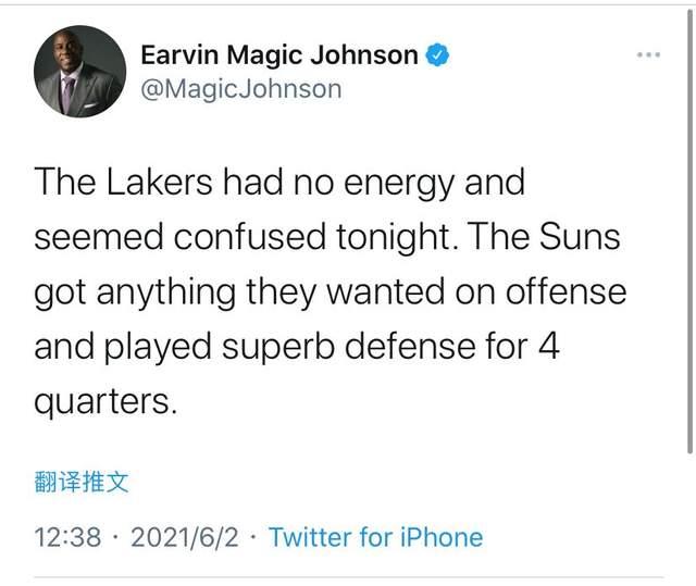 早早就取得了领先优势的太阳到最后也没有给湖人反扑的机会,他们顺利拿到了这场比赛的胜利,系列赛的总比分也来到了二比三。按照季后赛的赛制以及以往的情况来看,取得天王山之战胜利的球队往往可以取得系列赛的胜利,这也表明湖人很可能在首轮就会被淘汰出局。而作为湖人昔日的名宿球员,魔术师在观看完这场比赛之后也忍不住在社交媒体上发文:湖人整场比赛打得毫无能量,他们让太阳予取予求了。