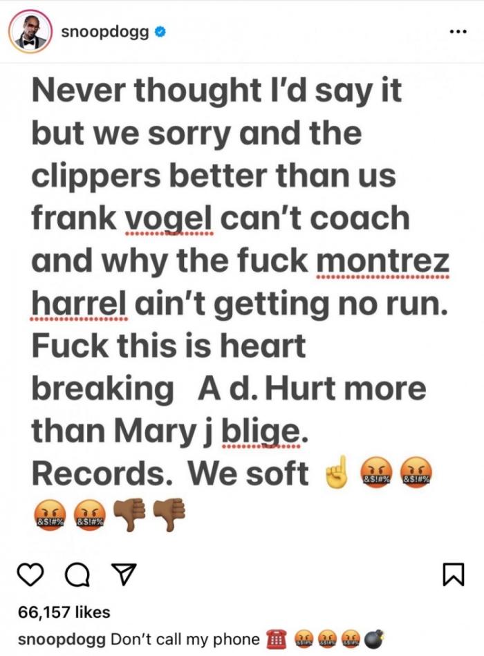 狗爷“从没想到我会这么说,但是很抱歉,快船比我湖强。弗兰克-沃格尔不会执教,为什么TMD哈雷尔得不到上场时间。操,这真的让人心碎。AD受伤的次数比玛丽-布莱姬的唱片还要多。我们太软了!”