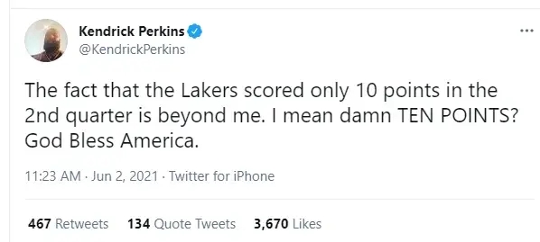 帕金斯狂喷施罗德就这水平还敢拒绝4年8400万?然后还表示“今晚湖人做得最好的一件事就是为大家观看利拉德的表演让开了道路。现在我要面对的一个事实是,湖人第二节得了10分”,我的意思是,XX的10分?上帝保佑美国。”