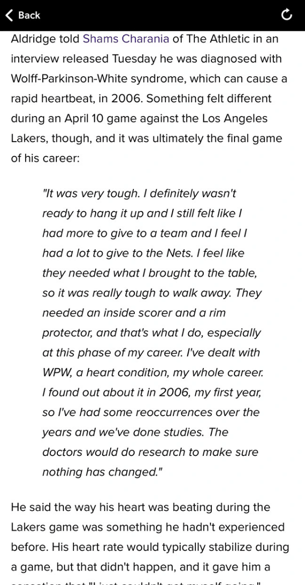 而谈到做出退役决定“篮网是一个无比拥抱我的地方,我也拥抱着他们,这对我来说无比苦涩,我终于在一个团队找到了一直在寻找的凝聚力,然后突然之间我就打不了了。我觉得如果待在那里,我们绝对能挺进总决赛,完成一些特别的事。那些队友们支持我亦如我支持他们,这便是比赛的乐趣所在。”