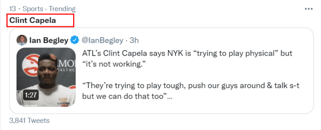在双方的第4场比赛中,尼克斯输给老鹰17分,比赛还剩3分5秒时,尼克斯落后24分,兰德尔被判了一级恶意犯规。卡佩拉说:“我不知道他们是否强硬,但他们正试图打得强硬,我只是觉得如果他们真的足够强硬,我们本该碰到更多的困难。”